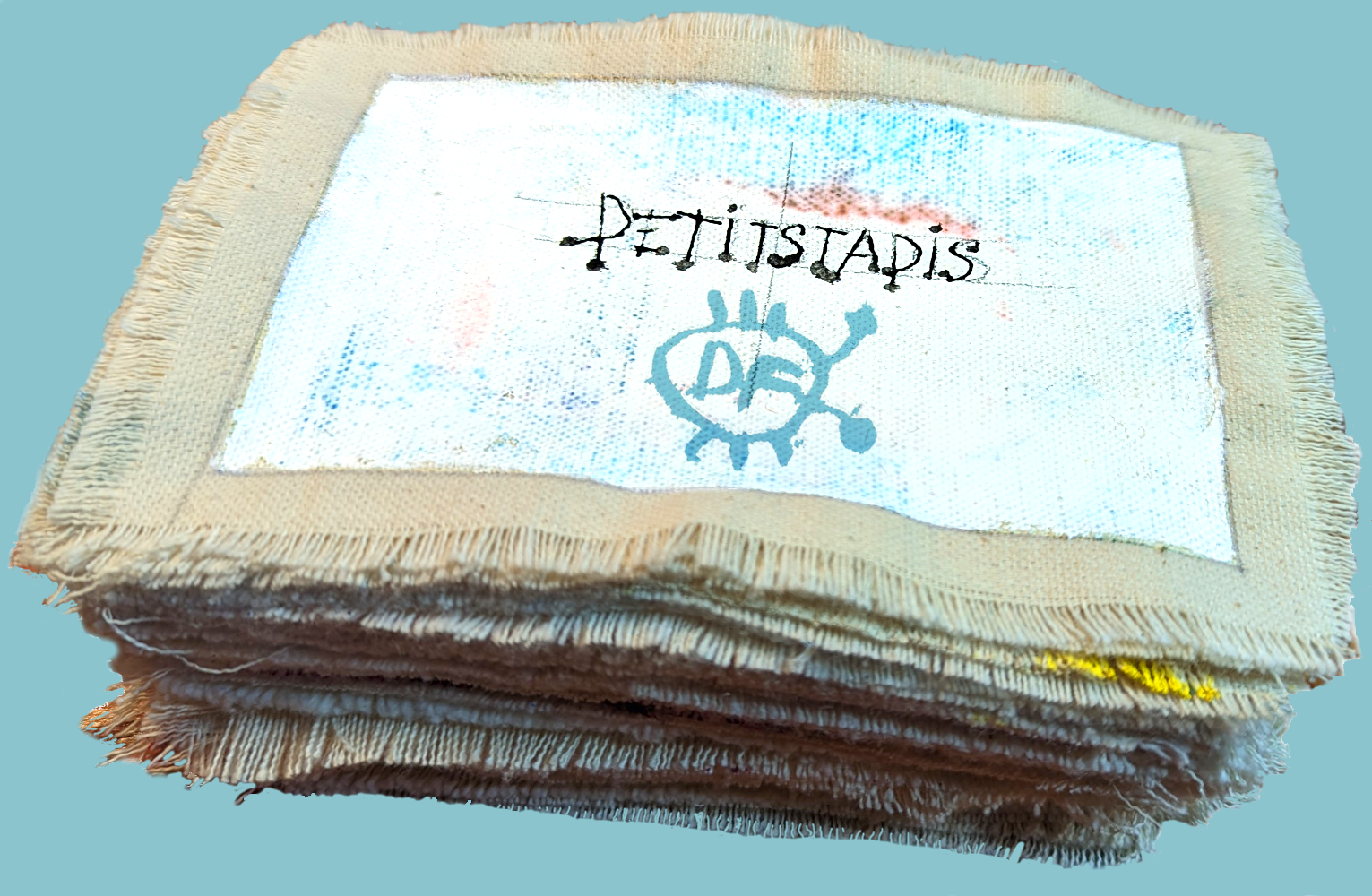 In the time of AI, and in the context of everything atomized, digitized, in a world of IoT, where every Midjourney image is ever more detailed, polished but without a breath of life, or spirit. I painted small, abstract and whimsical "small rugs" which I call PETITSTAPIS. These are rough, with stains ,smudges, bavures. They all are "unfinished" suspended in time, waiting patiently to be looked at, an invitation to dream.